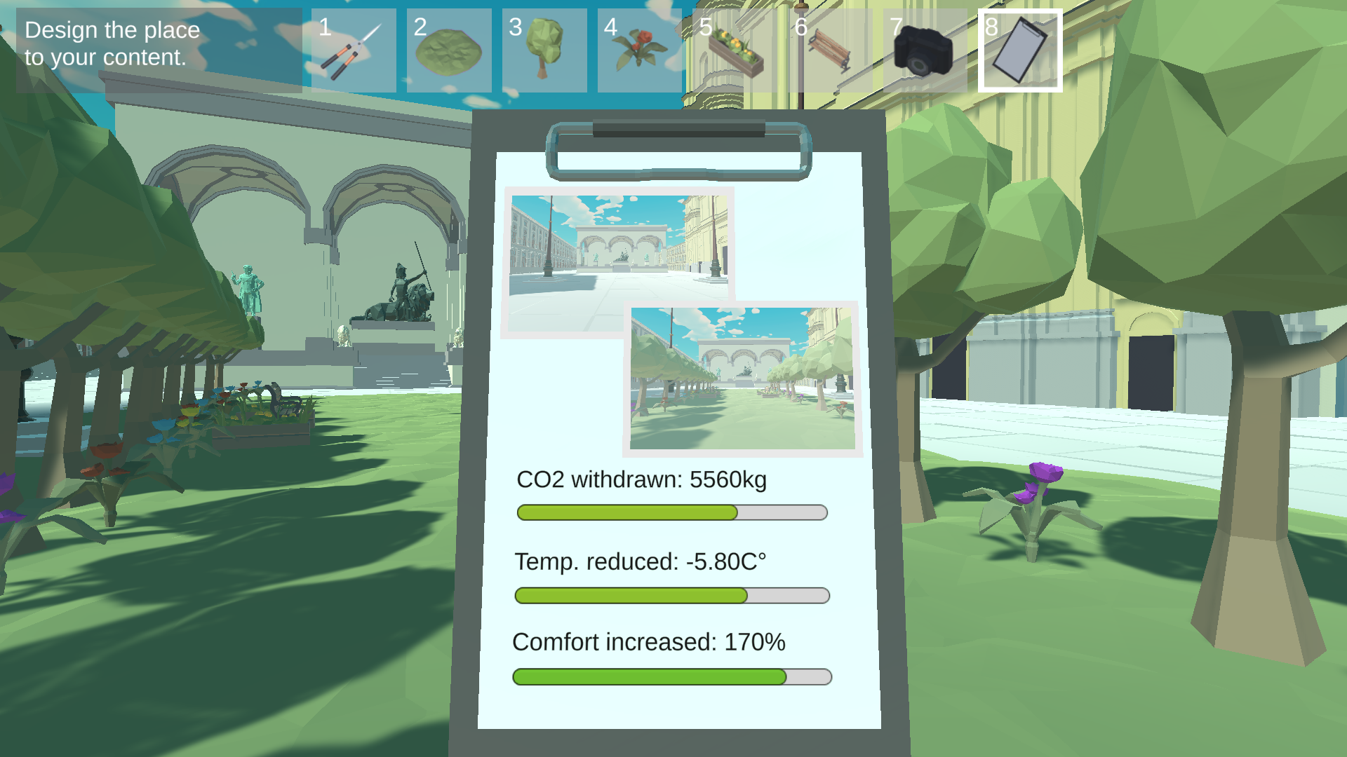 Create a green area that improves the air temperature, CO2 balance and comfort of the Odeonsplatz by following the instructions given to you (upper left corner).